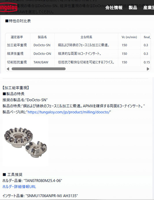 2025年初のドリル版を手始めに、正面フライスカッター版&高送り工具版、外径溝入れ工具版、肩削り工具版、タップ(ねじ切り)版をホームページで掲載中。正面フライスの場合は加工タイプ、被削材や工作物の状態、干渉条件などの項目に入力すれば、システムが最適な工具を自動で選定する。