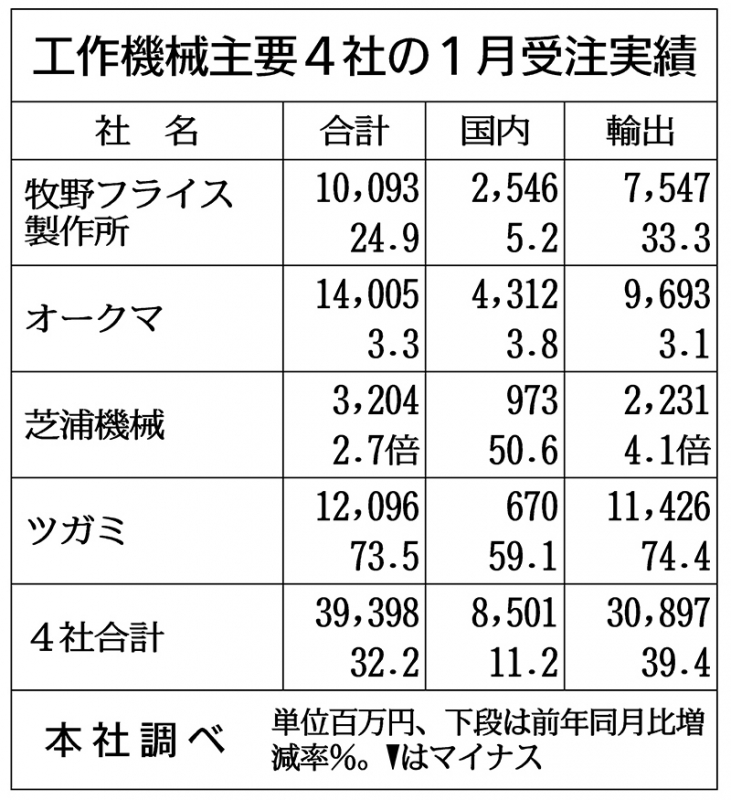 日刊工業新聞社がまとめた工作機械主要4社の1月の工作機械受注総額は、前年同月比32・2%増の393億9800万円と20カ月連続で増加した。全社が輸出と国内ともにプラスとなった。