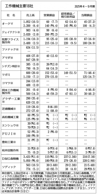 一方、オークマは26年3月期の営業利益予想を5月公表比80億円減の140億円に下方修正した。米国と日本で大手企業を中心に防衛や航空宇宙関連などの大型案件が活況だったが、米関税政策の影響により両国で「一番のボリュームゾーンの中小事業体が投資を控えた」(家城淳社長)ことが響く。特に米国では利益率の高いジョブショップ(部品加工を受託する中小製造業者)向けの伸びが想定を下回っていることが大きく影響する。