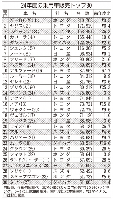 4位はダイハツの軽「タント」がランクイン。ダイハツは7月にタントの特別仕様車を発売した。「新型ムーヴ目当てに来店した顧客が一部流れ、タントの販売増につながった」(ダイハツ)という。一方、9月まで5カ月連続で首位をキープしていたホンダの軽「N―BOX」は同24・0%減の1万2784台で5位に後退。軽自動車のみの車名別新車販売で「同車の首位陥落は17カ月ぶり、ベスト3圏外となるのは130カ月ぶり」(全軽自協)という。