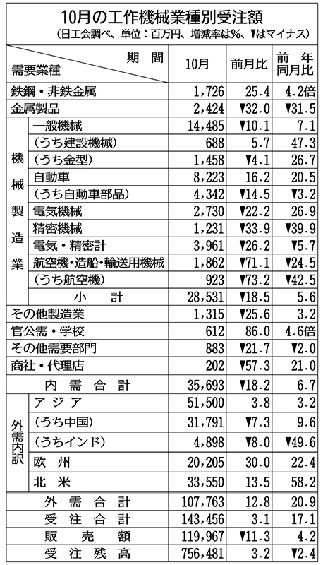 厳しい状況が続く内需だが、2カ月連続で350億円を超えた。航空機・造船・輸送用機械向けは9月に過去最高を更新した反動減で同24・5%減となったが、車向けが同20・5%増と3カ月ぶりに80億円を上回った。日工会では「ティア1(1次取引先)を中心に設備投資に対する意欲の高まりが夏場以降感じられる」(同)としている。