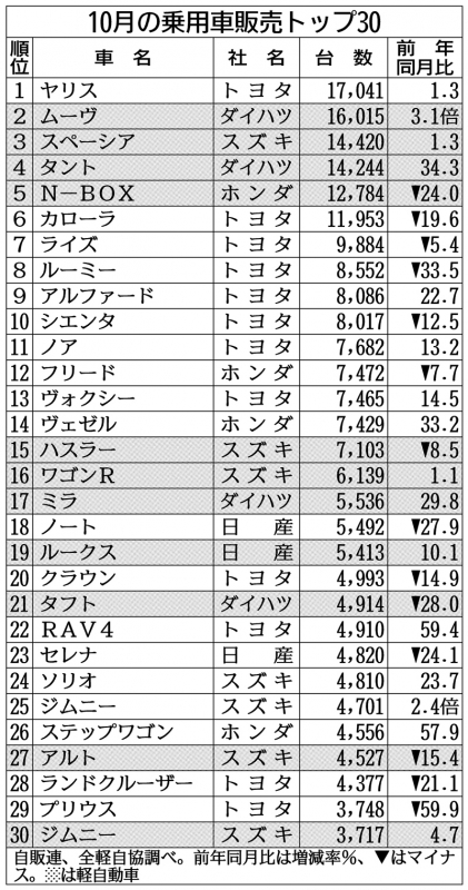 日本自動車販売協会連合会(自販連)と全国軽自動車協会連合会(全軽自協)が公表した10月の車名別新車販売によると、トヨタ自動車の小型車「ヤリス」が前年同月比1・3%増の1万7041台で、4月以来6カ月ぶりに首位に返り咲いた。2位は6月に新型を投入したダイハツ工業の軽乗用車「ムーヴ」で、同3・1倍の1万6015台と躍進。3位はスズキの軽「スペーシア」で同1・3%増の1万4420台だった。上位5車種のうち4車種を軽が占めた。