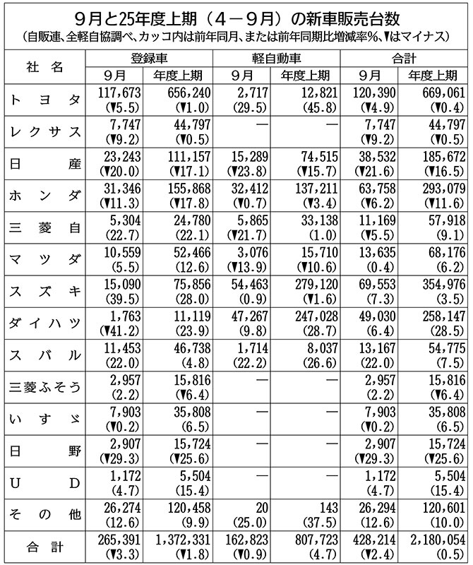 日本自動車販売協会連合会(自販連)と全国軽自動車協会連合会(全軽自協)が発表した2025年度上期(4―9月期)の新車販売台数は、前年同期比0・5%増の218万54台となり、2年ぶりに増加に転じた。前年同期に認証不正による出荷停止などが影響した反動でプラスとなったが、新型車の投入が少ないことが響いて微増にとどまった。