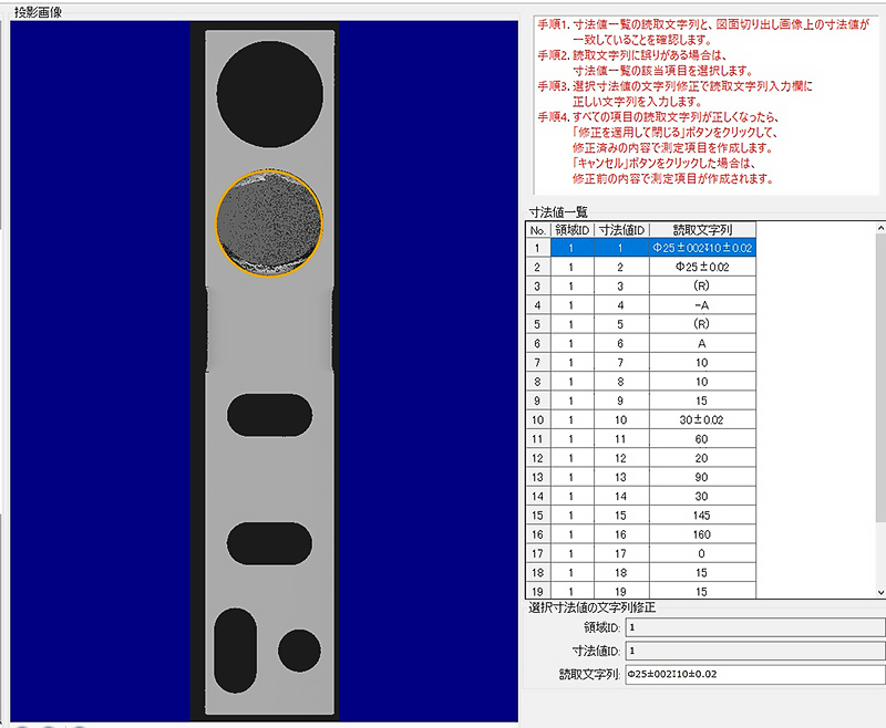 紙図面をPDFデータに変換して同ソフトに読み込ませると、外形線や寸法線、寸法補助線を区別し、加工物の長さや穴の直径といった寸法と公差を読み取る。それらをDMS―800による測定値と比較する表が作成され、測定値が公差以内に収まっているかどうかを判定する。