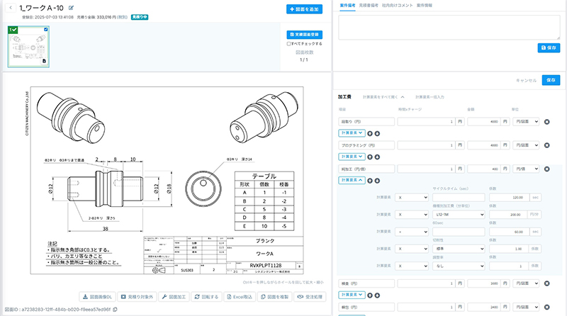 顧客は検索した類似図面の見積もりを基に、形状や材料の在庫状況、加工機種など過去との違いを調整すれば見積もりを作成できる。中小規模の加工業者では社長を含む数人が見積もりの作成を担当。見積もり依頼を1日数十件受けることもあり、作業負担の軽減やノウハウの属人化・継承が課題だという。