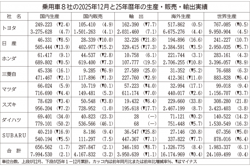 乗用車メーカー8社が発表した2025年の生産・販売・輸出実績によると8社合計の世界生産台数は前年比0・4%増の2416万9499台で2年ぶりに前年超えとなった。
