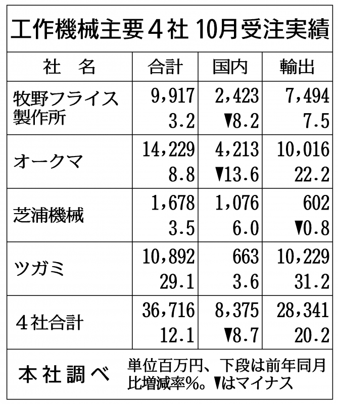 工作機械4社、10月受注12%増 輸出堅調、国内低迷補う